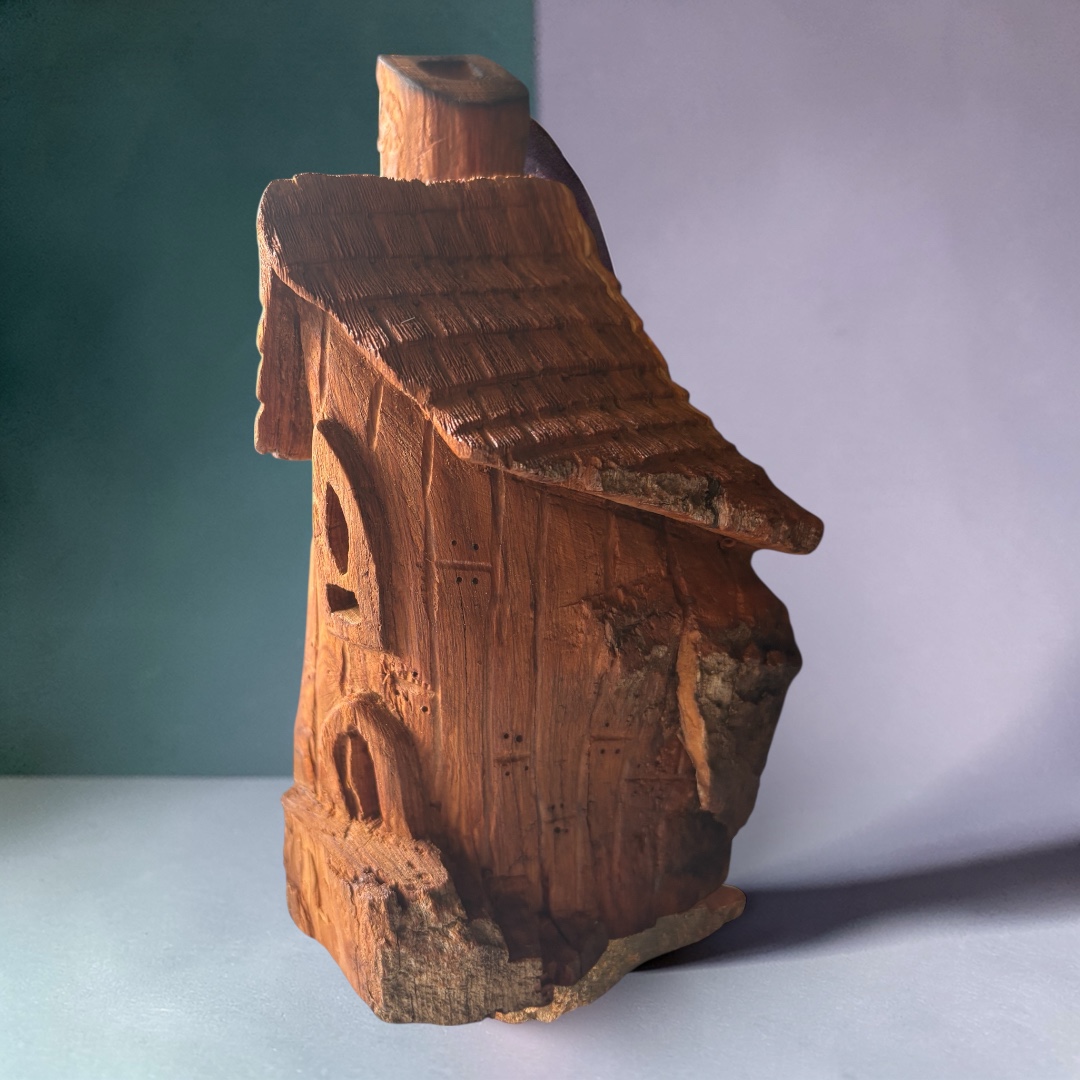 Appalachia Camp is a carved cottonwood bark sculpture of a small house with a steeply pitched roof and a chimney. The house features finely detailed textures on the roof and walls, suggesting wooden planks and shingles. Arched doorways and windows are carved into the structure, along with subtle natural imperfections in the wood, adding character…