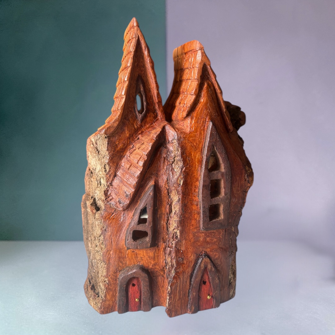 Fernlea Suitesis a small, intricately carved cottonwood bark sculpture resembling a whimsical house with steep, pointed roofs and narrow windows. The texture of the wood enhances the rustic and natural feel of the piece, with detailed carvings that define shingles on the roofs and the outlines of the windows and doors. The house has two weatherd orange front doors, each with small circular knobs, and tall, narrow windows that add character to the structure. The overall shape is elongated and vertical, with a charming, fairy-tale-like appearance. The natural wood tones range from light to dark brown, providing depth and contrast to the details.