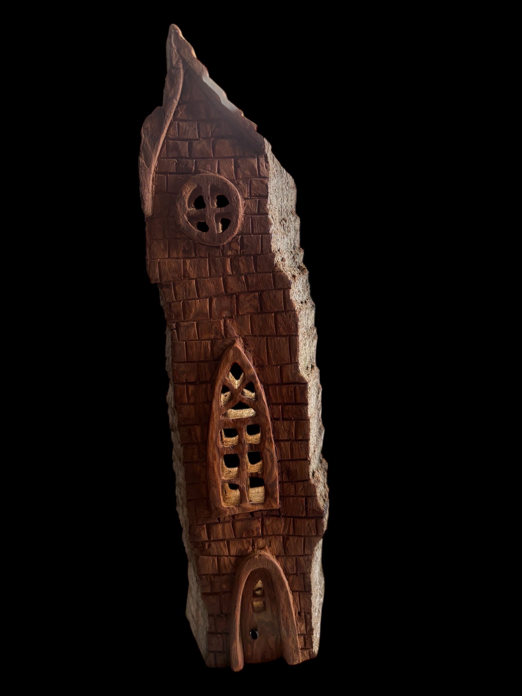 Gothic Tor is a sculpted from cottonwood bark. It resembles a medieval tower It has a textured surface mimicking brickwork, with a pointed top that is jagged. The sculpture includes three distinct window shapes: a circular window near the top, a tall, narrow gothic-style window with multiple panes in the middle, and an arched doorway at the base. The edges of the sculpture is rough and uneven, contrasting with the detailed brick pattern on the front face. The piece is rendered in earthy, reddish-brown tones, enhancing its rustic, aged appearance.