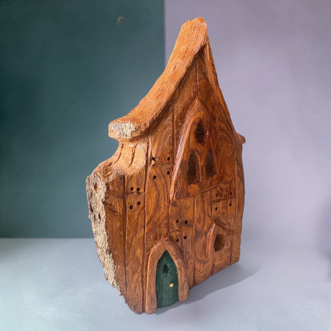 Green Door Inn is a cottonwood bark sculpture depicting a stylized house. The structure features an asymmetrical, sloping roof with a rough, natural texture on one side, maintaining the wood’s original edge. The front of the house has arched windows of varying sizes and shapes, carved into the wood, along with a small, green door…