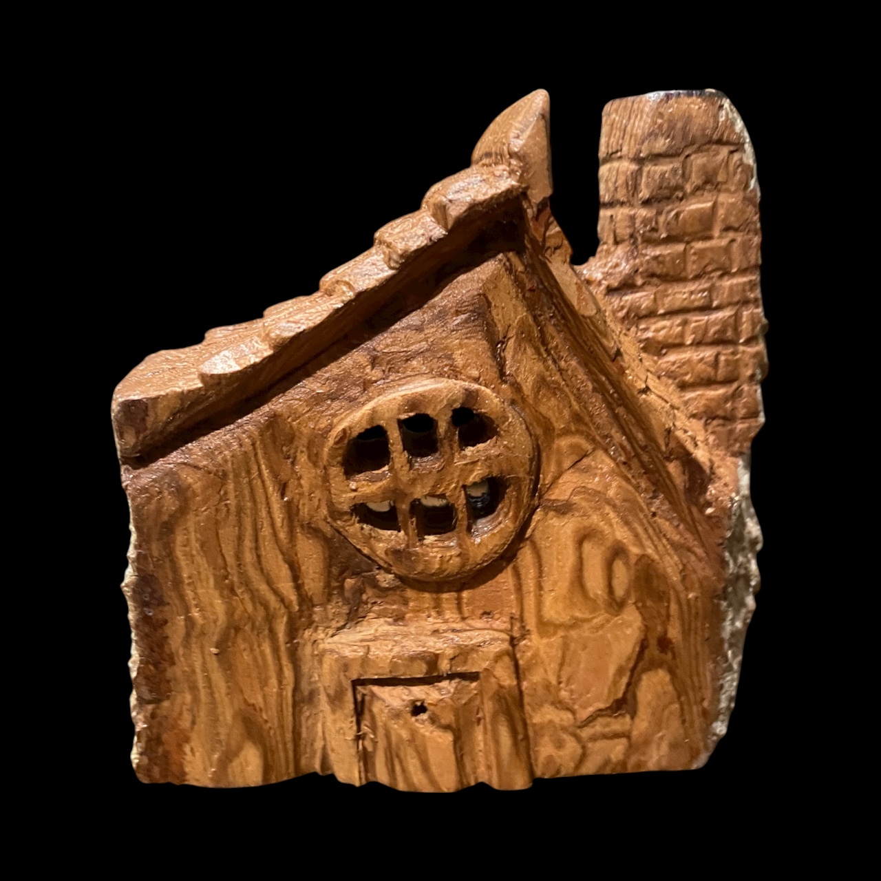 Home Port is a detailed wooden carving of a small house. It features a triangular roof with a scalloped edge pattern along the eaves. The front of the house has a circular window divided into multiple panes and a simple rectangular door below it. On the right side, there is a prominent chimney designed with a brick texture. The wood grain and natural patterns enhance the texture and depth of the piece, giving it a rustic and handcrafted appearance. The carving emphasizes architectural elements with a charming and quaint style.