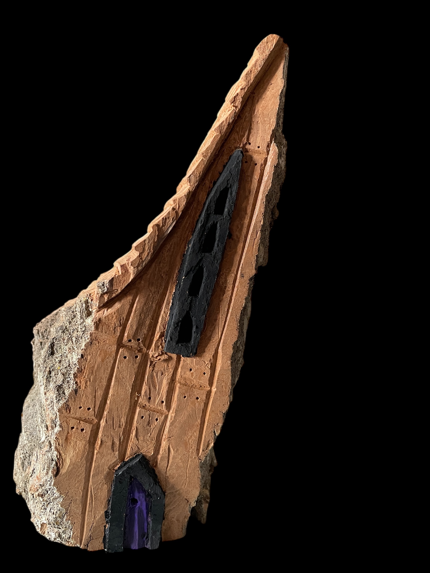 Purple Pinnacle is a vertically elongated, triangular-shaped piece of cottonwood bark. Two vertical, narrow, window-like shapes are deeply embedded into the surface—one larger and positioned towards the middle, and a smaller one near the base. These shapes are dark in color, with a hint of purple in the lower window, creating a striking contrast against the earthy, reddish-brown tone of the main material. The overall composition suggests a stylized representation of a tall, narrow building or tower, emphasizing verticality and depth.