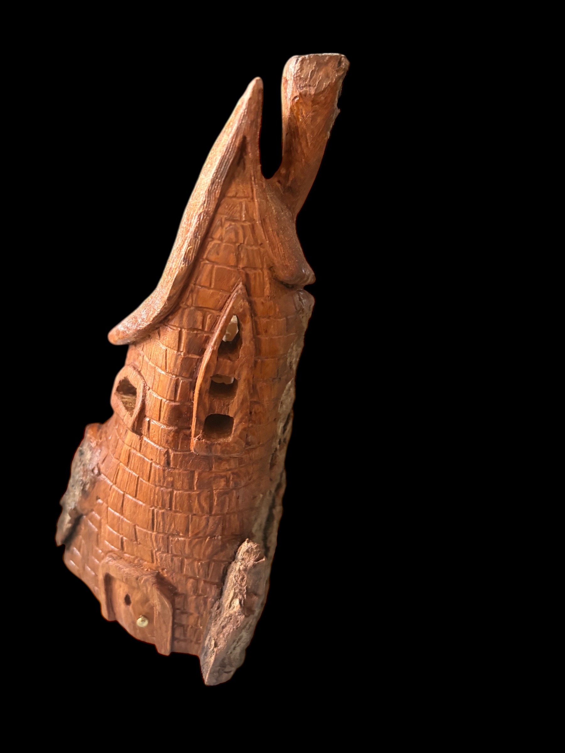 Reed Roof Inn is a detailed cottonwood bark sculpture of a whimsical house featuring a tall, narrow, and uneven thatched roof with a chimney. The structure is crafted with intricate brick patterns and multiple arched windows, giving it a fairy tale or fantasy-like appearance. The door at the base is small and rounded, complementing the overall rustic and charming aesthetic. The sculpture is carved with careful attention to texture and form, highlighting the craftsmanship in wood.