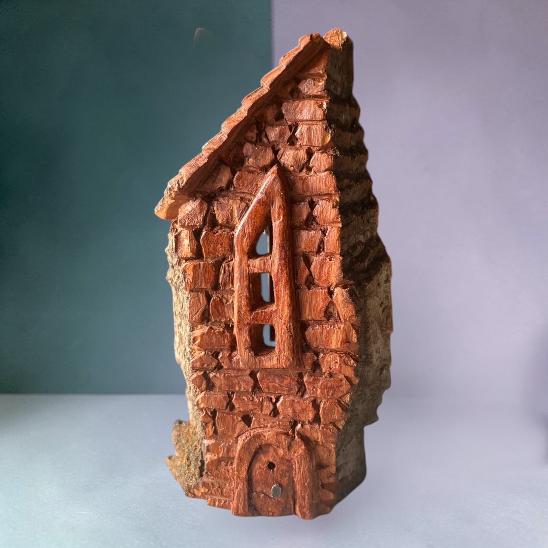 River Rock Place is a detailed carving of a small, rustic house made from a piece of cottonwood bark. The house features a slanted roof on the left side, textured with carved lines to represent shingles. The front wall is made up of unevenly shaped bricks, meticulously carved to give a rough brick texture. There…