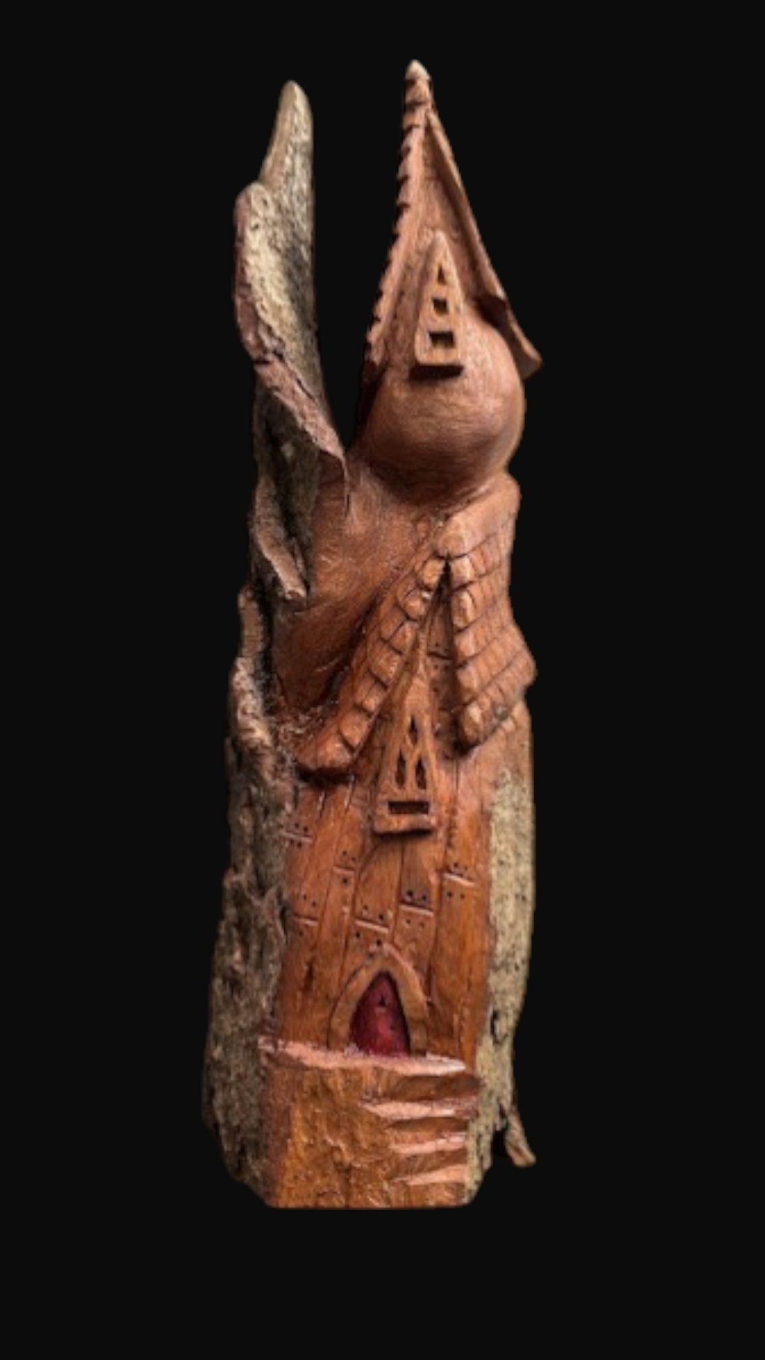 Scarlett Spire is a detailed wood carving integrated into a natural cottonwood bark. The carved section transforms the wood into a whimsical, elongated structure resembling a fantastical house or tower. It features architectural elements such as arched windows and a small, pointed entrance door that is stained scarlett with steps leading up to it. The…