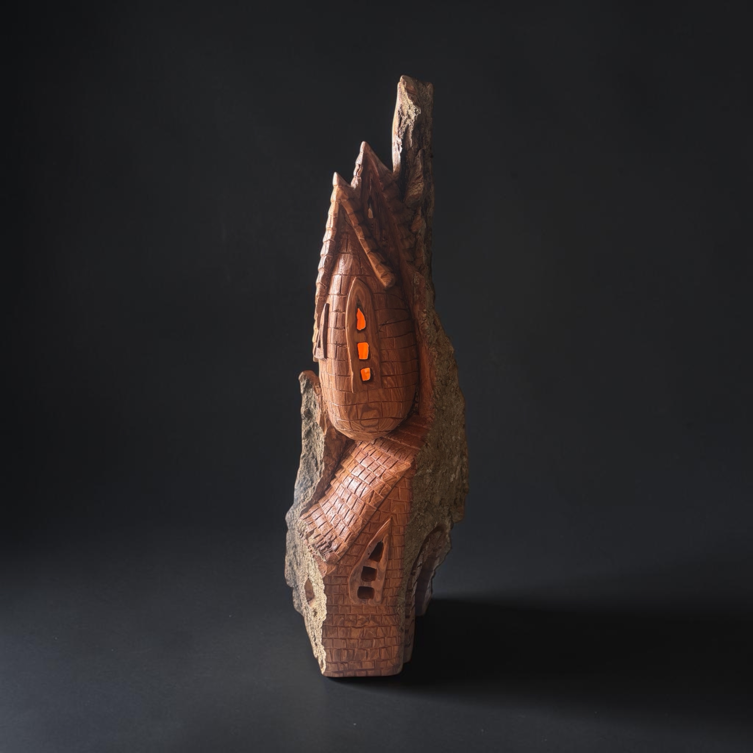 Starwood Castle is a vertical cottonwood bark sculpture intricately carved to resemble a whimsical castle integrated into the natural form of the wood. The structure has pointed, steeply pitched roofs and a textured brick pattern covering the walls. Small rectangular windows are embedded within the carved walls, creating the effect of an illuminated interior. The piece combines organic bark texture with detailed architectural elements, merging natural wood and crafted fantasy architecture into a single harmonious form.