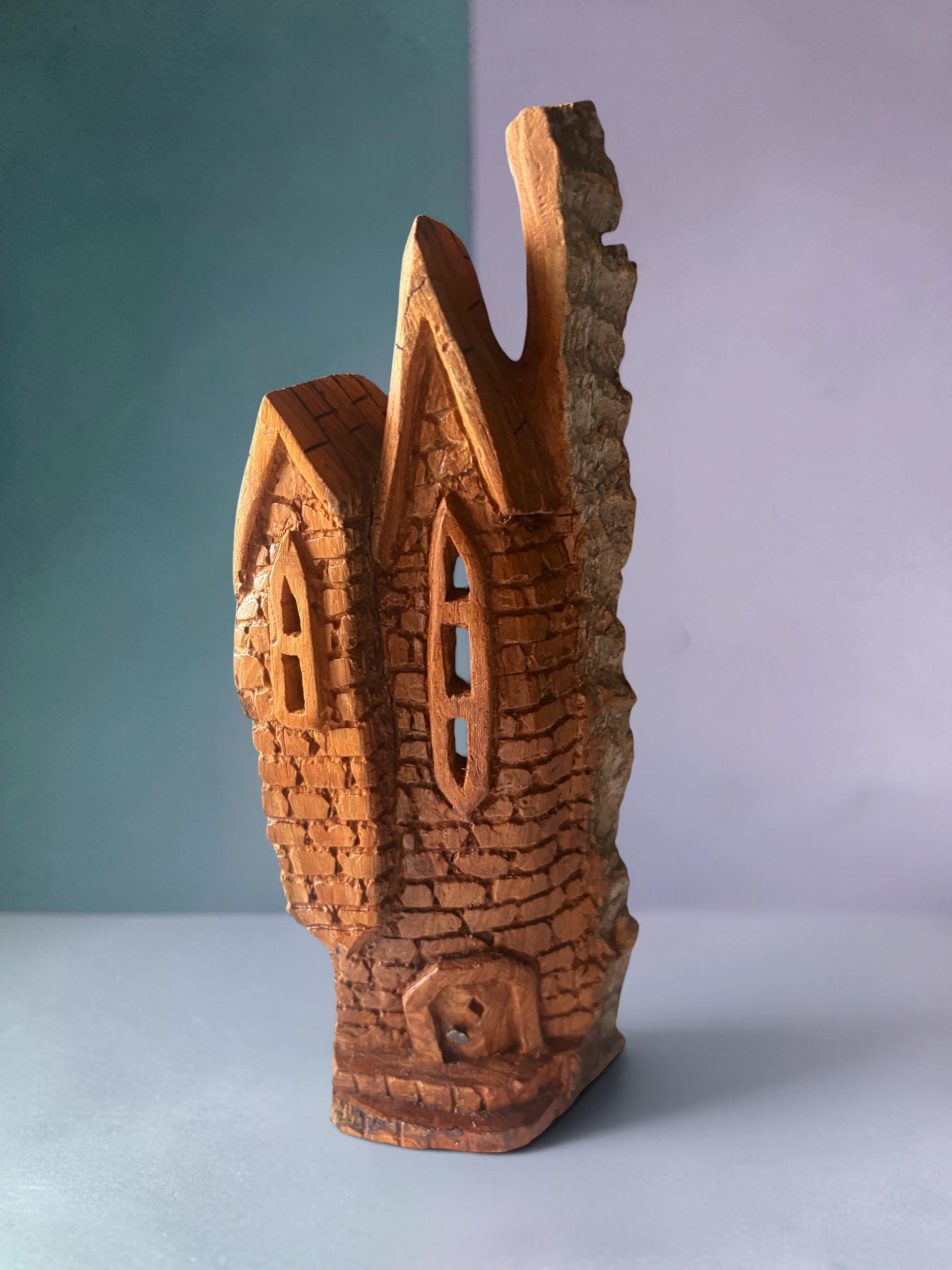 Rising with quiet authority, “The Stonecroft” evokes the charm of an ancient stone tower, where time seems to slow among weathered bricks and shadowed turrets. Two narrow, pointed windows pierce the textured façade like watchful eyes, their delicately carved arches hinting at stories untold. The wood’s natural edge on one side contrasts sharply with the refined, polished front, grounding the piece in both nature and craftsmanship. Tapering into twin peaks, the form suggests a realm of imagination and mystery, inviting the viewer to explore its whispered secrets. The sturdy base anchors this slender sentinel, embodying a balance between strength and delicate artistry.