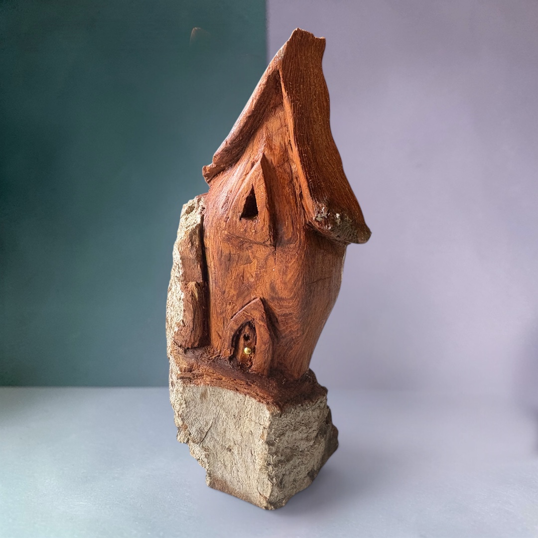 The artwork is a carved cottonwood bark sculpture in the shape of a whimsical house. The house features an exaggeratedly tall, slanted roof with textured, curved lines suggesting shingles or wooden planks. There is small, triangular windows carved into the structure, one above the other, with the lower window framed by an arched doorway. The…
